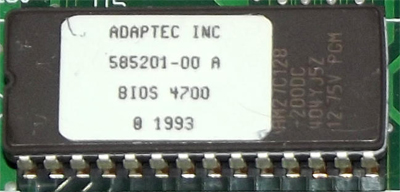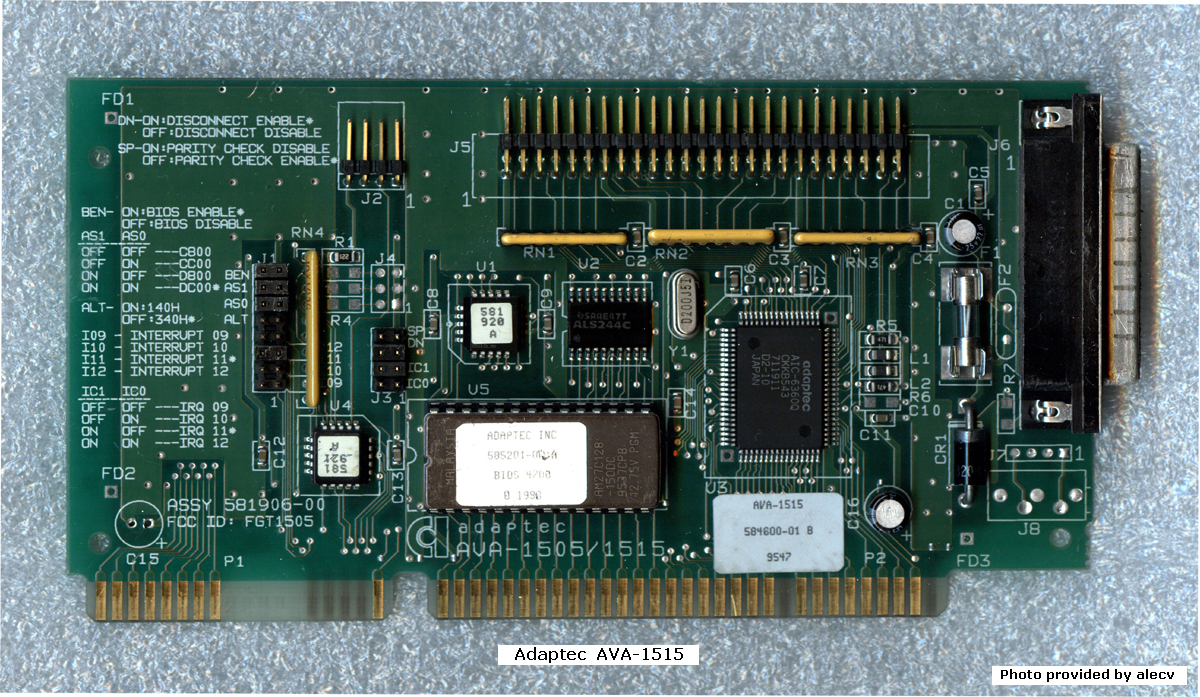 | Adaptec | AVA-1515 | 16-bit SCSI controller | '93 | 1.20L | U5 | BIOS | 4700 | [27C128] | 16 KB | D | alecv | Download | Based on the AIC-6360 chip. "585201-00 A BIOS 4700" on U5 ROM sticker. "4700" bit is 16-bit checksum. |