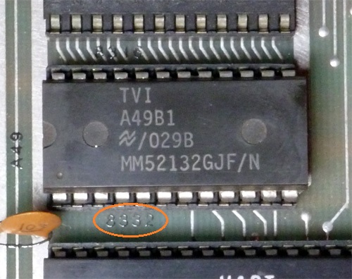 | Note 7 | The system board appears to be designed to take either one 4KB ROM in socket A49, or two 2KB ROMs in sockets A49/A50. There are links for that, and links to accommodate certain different types of ROM. My 912B has a single 4KB ROM in socket A49, a MM52132, which from a reading perspective, is the same as a 8332 ROM. By modification, I successfully used a TMS2532 in the A49 socket. To do that, after burning, I took pin 21 high, which can be done by either of the following: 1. Alter links W35/W36; or 2. TMS2532 modification. Photo here. |