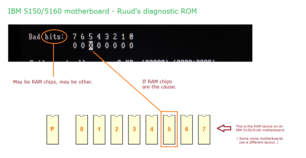 | Note 1 | It is possible for a RAM chip to fail in such a way that affects only some of the chip's addresses. Imagine such a chip in bank 0, one that fails at say the 5K address. That would result in the diagnostics 'Check first 2 KB of RAM' test passing. But the diagnostic will report an error later when testing the remainder of RAM. |