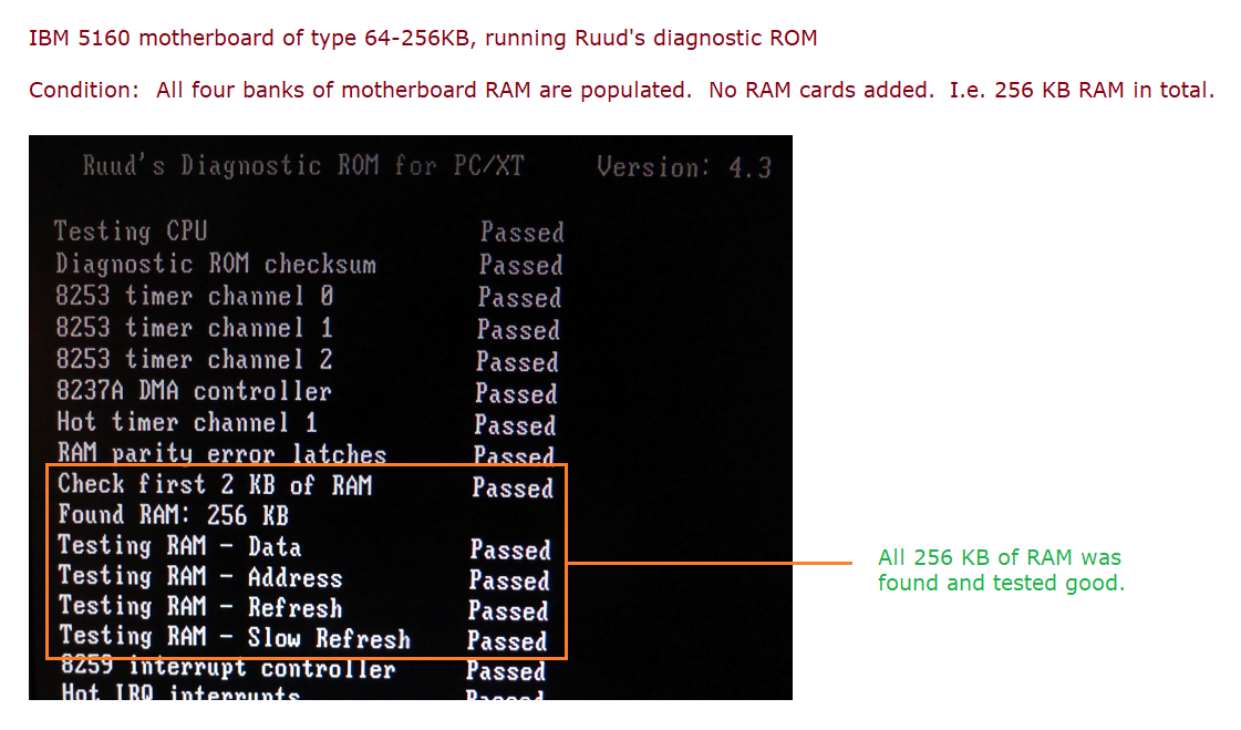 | Only bank 0 is populated, and all chips in it are good | See the partial screen shot at here. | 1 bank of 64 KB = 64 KB |