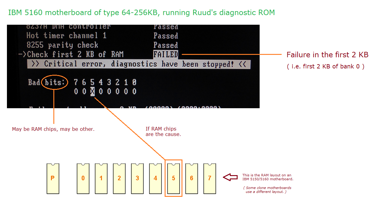 | Note 1 | It is possible for a RAM chip to fail in such a way that affects only some of the chip's addresses. Imagine such a chip in bank 0, one that fails at say the 5K address. That would result in the diagnostics 'Check first 2 KB of RAM' test passing. But the diagnostic will report an error later when testing the remainder of RAM. |