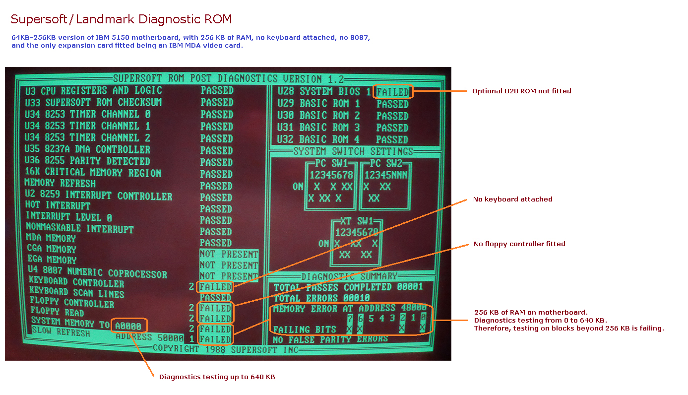 | • | The U28 ROM test is expected to fail, because there is nothing in the U28 socket. However, on some IBM 5150 motherboards, the test might pass. You may even see it pass sometimes, and fail at other times. |