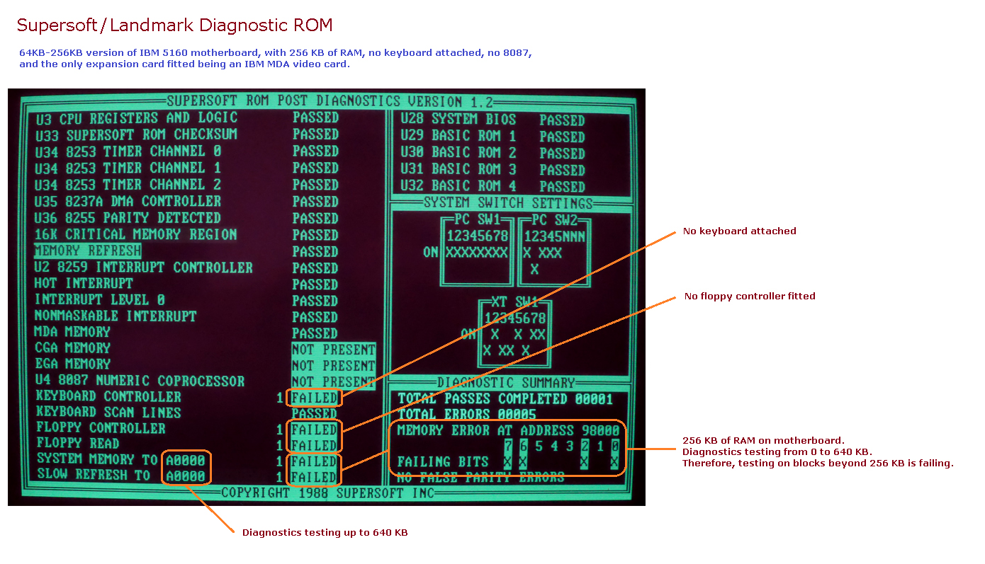 | • | The SYSTEM MEMORY TO A0000 test expects 640 KB of RAM is fitted. A0000 hex = 640 KB. If 640 KB is not fitted (motherboard plus RAM expansion card/s), the test will fail. |