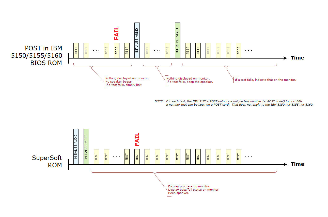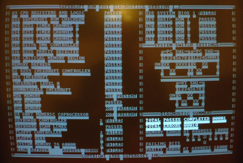 | • | If a test fails, do not take the test's description literally. For example, failure of the '8253 TIMER' test may not be due to a faulty 8253 TIMER chip, but instead, due to failure of something that supports TIMER chip operation (e.g. other chips, circuit traces, ...) The best analogy that I can think of is: On the dash of my car, a red 'battery' light is flashing. Yes, the battery may be faulty, but perhaps the problem is that the alternator is what is faulty, not charging the battery. |
