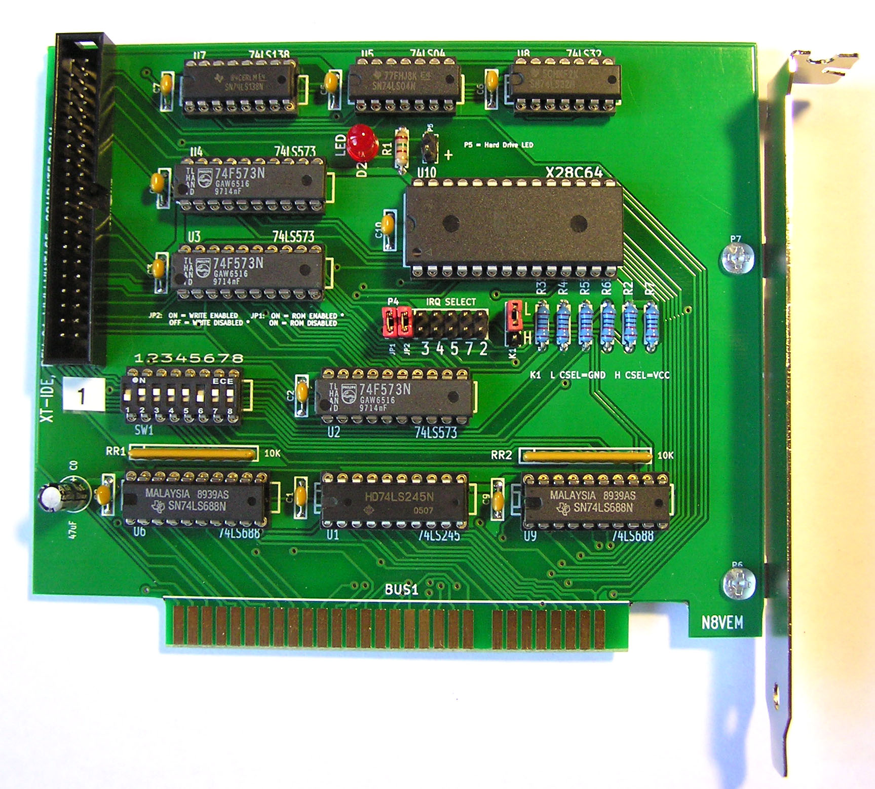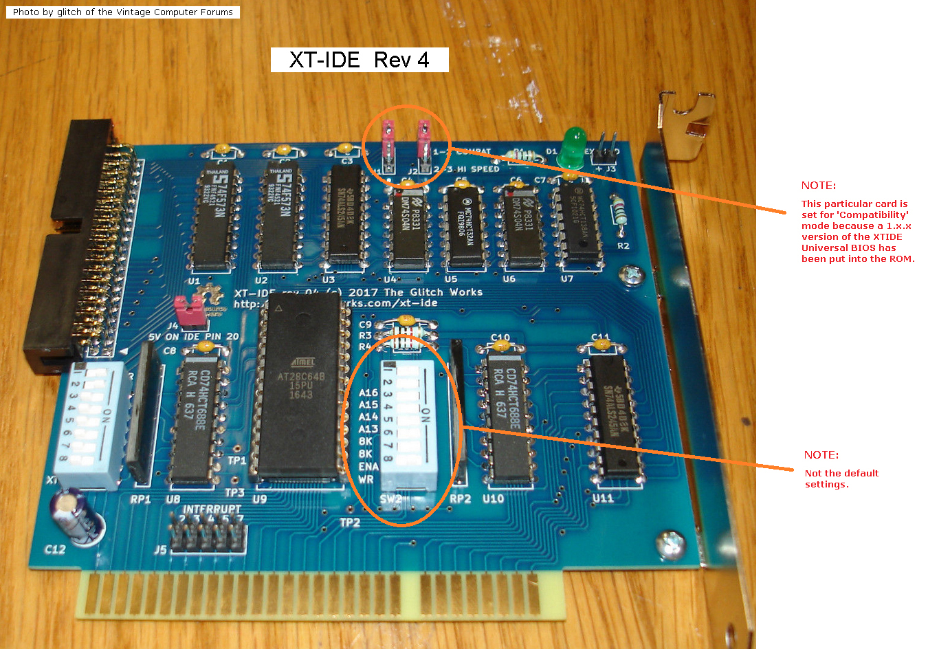 Circa 2019. Click on photo for larger view. Functionally equivalent to the Rev 4. Use the information for the Rev 4. A preconfigured image file for the EPROM/EEPROM is at here. Superceded by the Glitch Works XT-IDE Rev 4B. |