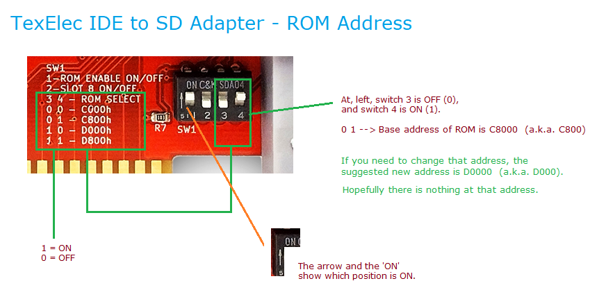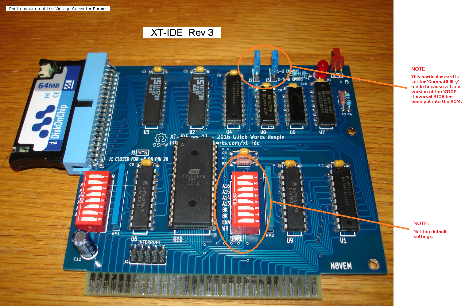 Circa 2009. Click on photo for larger view. Information at here. Configuration of adapter/controller/device type in XTIDE Universal BIOS (a.k.a. XUB): For 1.x.x versions of XUB (e.g. 1.1.5), set 'Bus type' in XUB per the photo at here. For 2.x.x versions of XUB (e.g. 2.0.0 beta 3+) , set the 'Device type' to 'XTIDE rev 1' For Rxxx versions of XUB (e.g. R625) , set the 'Device type' to 'XTIDE rev 1' |
