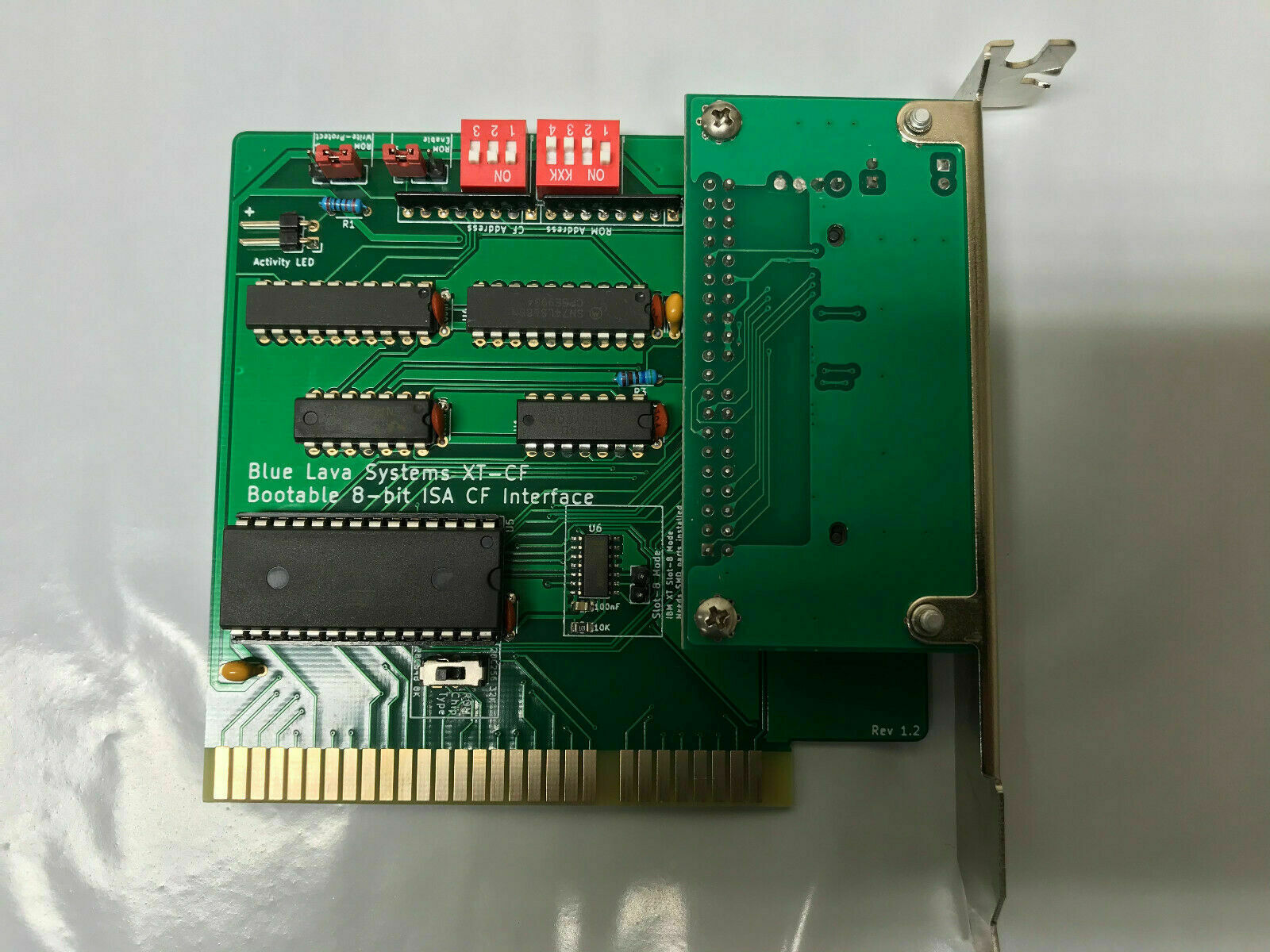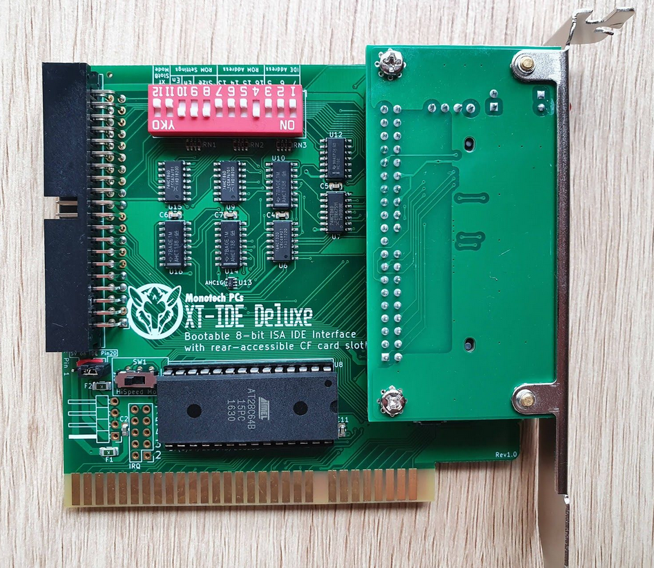 Click on photo for larger view. This is simply a rebranding of the 'Monotech XT-IDE Deluxe Rev 1.0'. "XT-IDE CF+" appears on back. Click here for back. Click here for end. Does not require a CF card that works in 8-bit mode. Configuration of adapter/controller/device type in XTIDE Universal BIOS (a.k.a. XUB): If SW1 is OFF, i.e. hi-speed mode is OFF, set the 'Device type' in XUB versions 2.x.x and Rxxx to 'XT-IDE rev 1' If SW1 is ON, i.e. hi-speed mode is ON, set the 'Device type' in XUB versions 2.x.x and Rxxx to 'XT-IDE rev 2 or modded rev 1' |