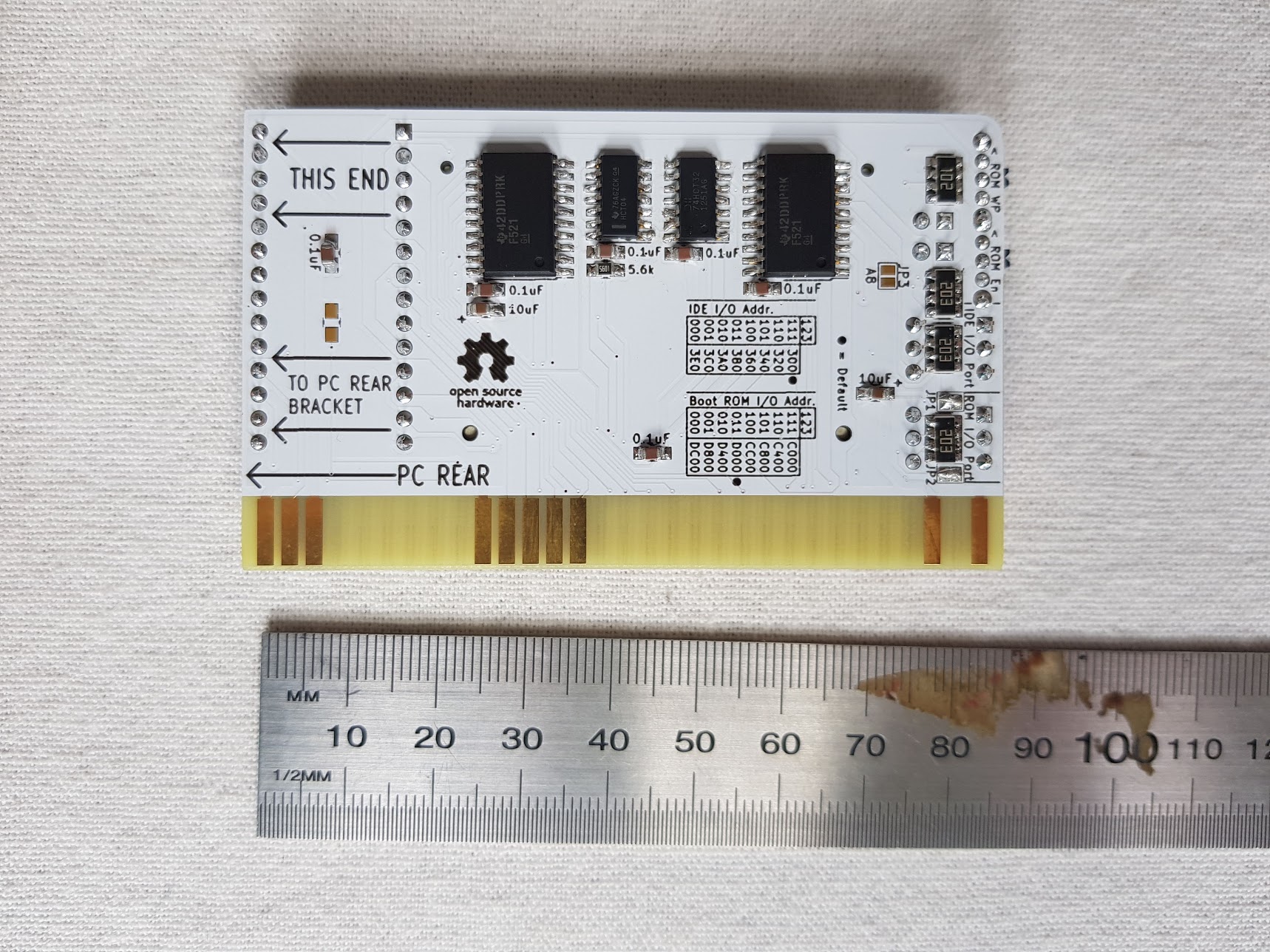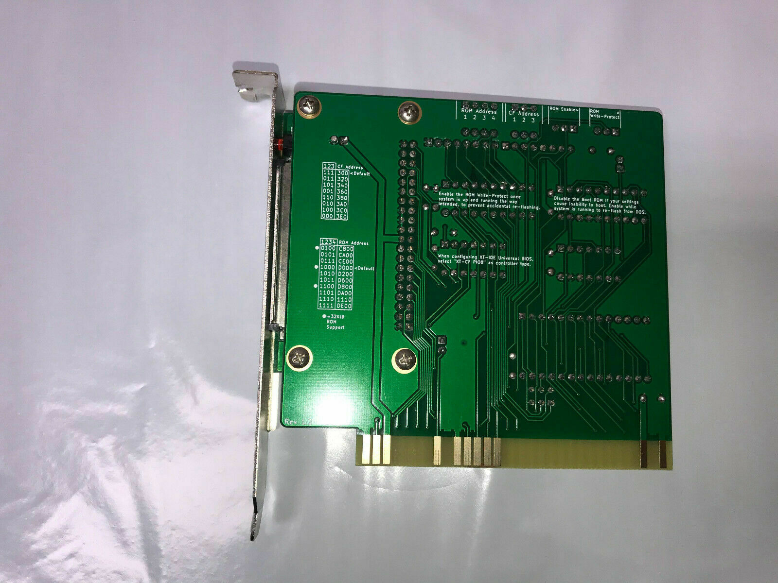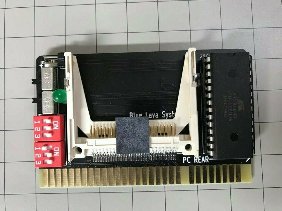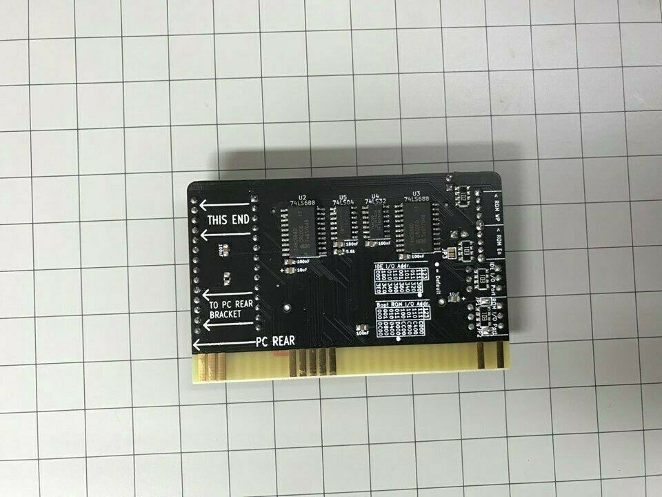 Circa 2023. Designed (based on other products) by 'spark2k06'. The designer's web page is at here. Note the wire link running over one of the IC's, which is part of the fix for a design problem. Details at the aforementioned web page. The base ROM address and base I/O port are fixed. There are defaults, that the supplier can alter at the time of ordering. Therefore, make no assumptions about cards 'seen in the wild'. |