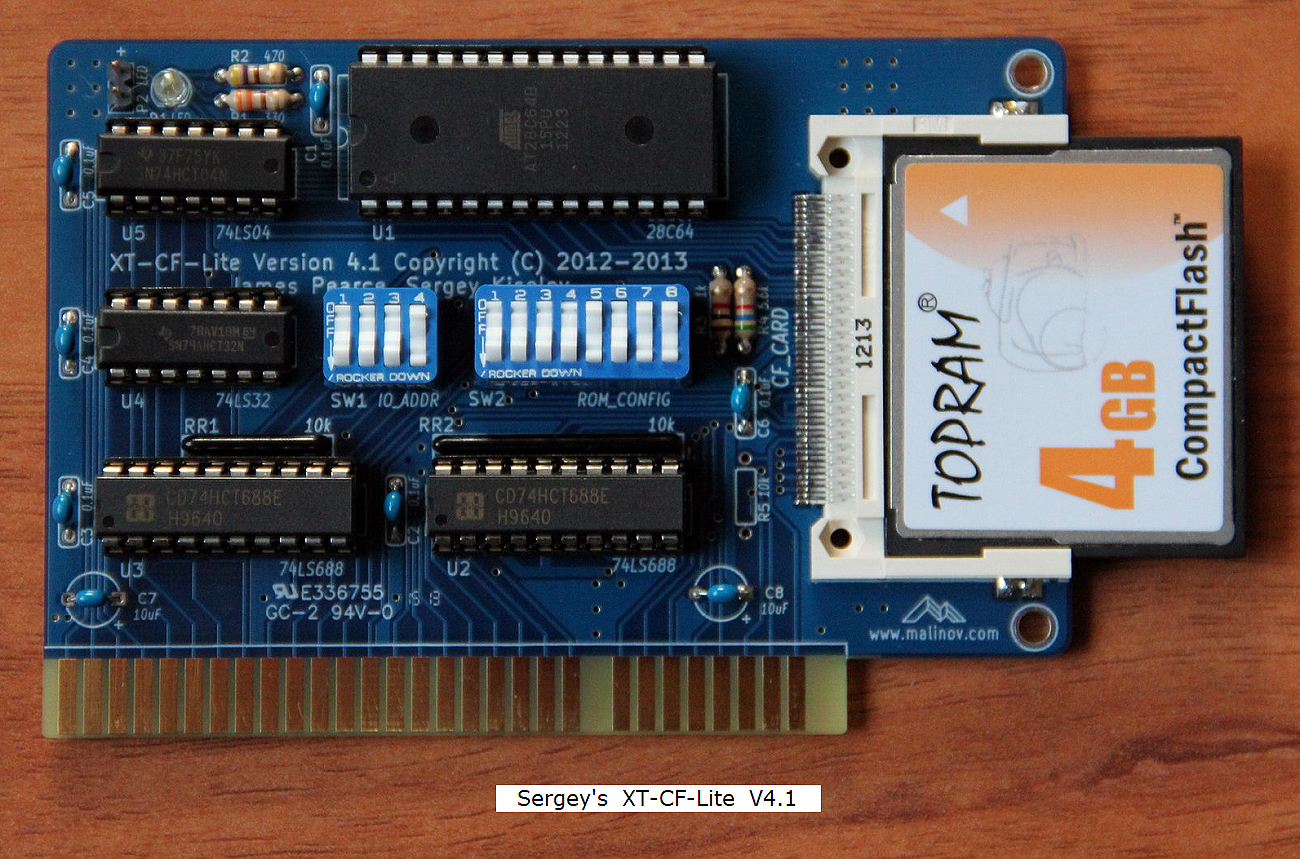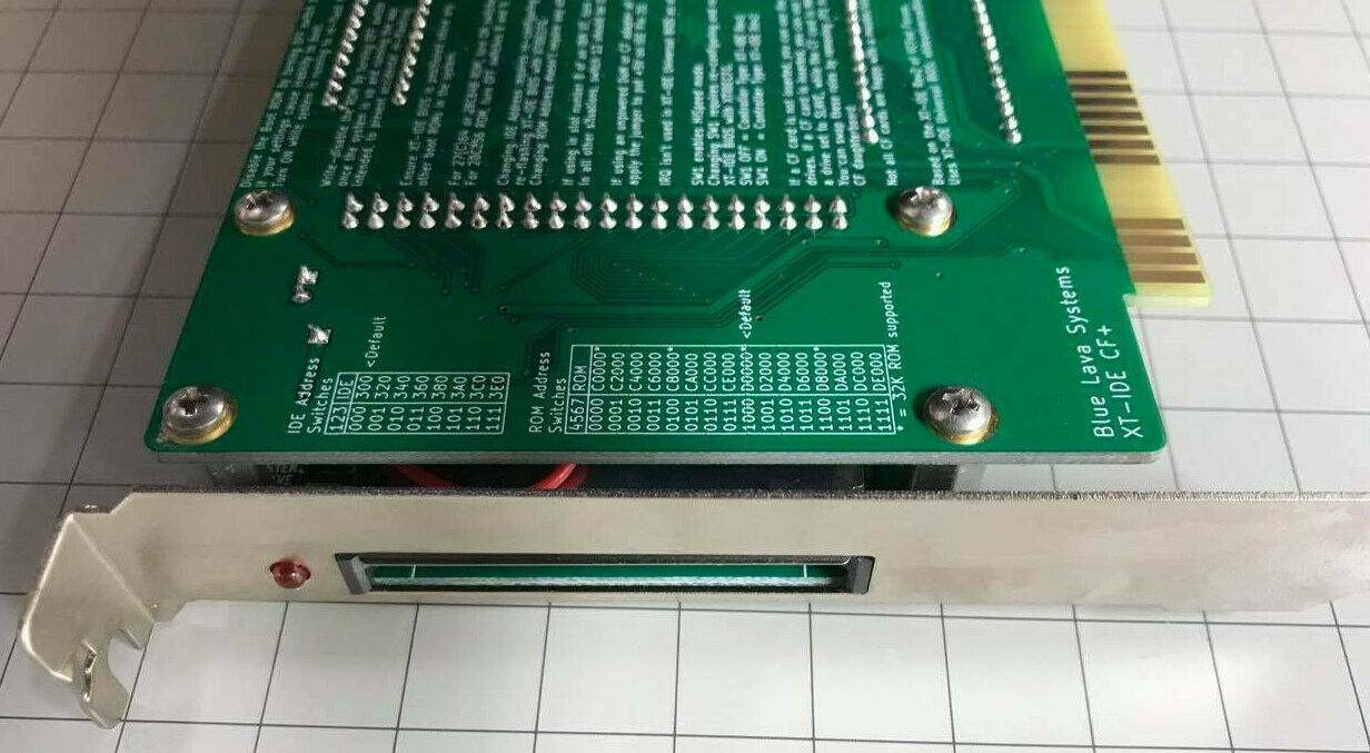 | Note 1 | Some XT-IDE/XT-CF cards can only use a CF card that supports 8-bit mode. If a maker of CF cards decided to drop support for 8-bit mode, surely that would have been late in the design/production timeline. Therefore, to increase the chance of 8-bit support, I suggest that you use CF cards of relatively small capacity, because they are likely to have been designed/produced earlier than larger capacity. In the photos above of XT-CF cards that require a CF card that works in 8-bit mode, 4 GB and 2 GB sized CF can be seen. Are those sizes a 'safe bet' ? I do not know. Of interest, is the 'Wed Oct 21, 2020 3:30 pm' post at here. |