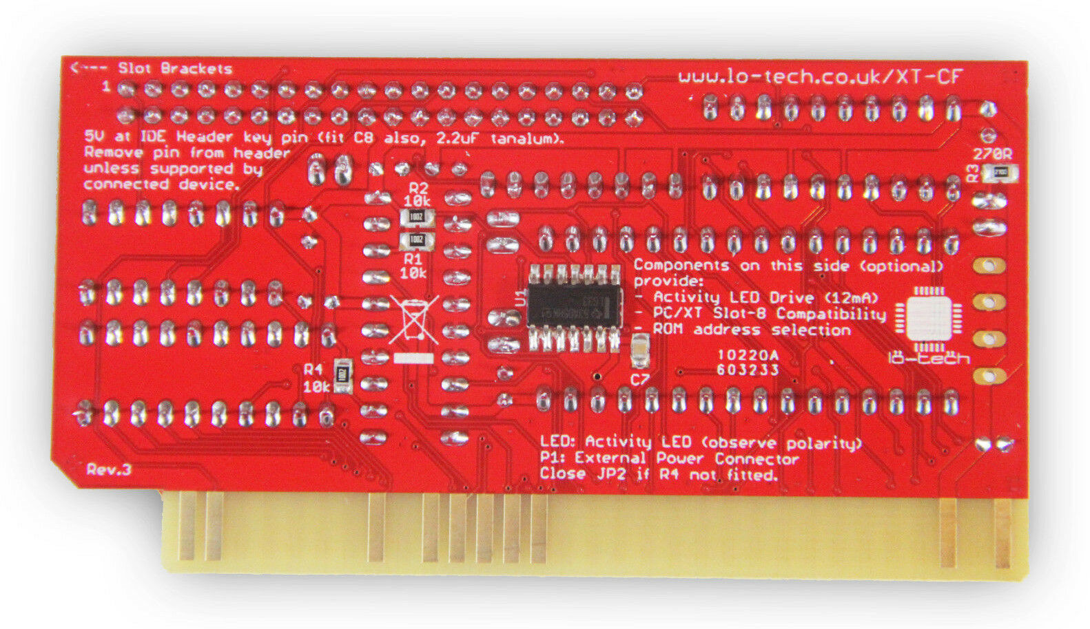 Click on photo for larger view. "Rev.3" appears on back of the card. Lo-tech's web page at here. Configuration of adapter/controller/device type in XTIDE Universal BIOS (a.k.a. XUB): Per the web page, set the 'Device type' in XUB versions 2.x.x and Rxxx to 'XT-CF (PIO with BIU Offload)' ('XT-CF BIU' being the shortened form of that)' |