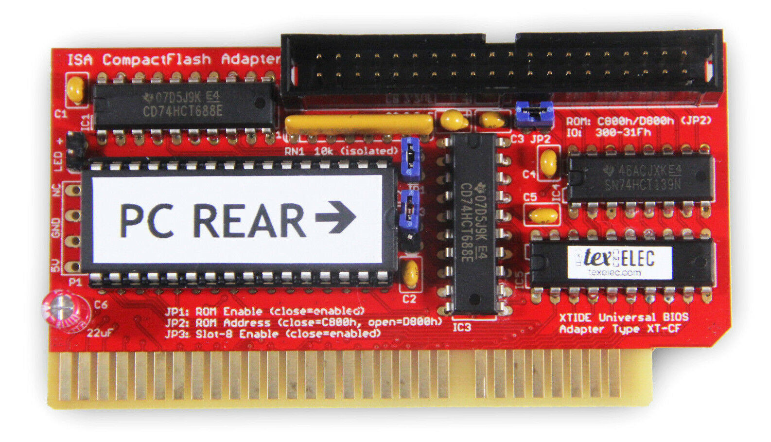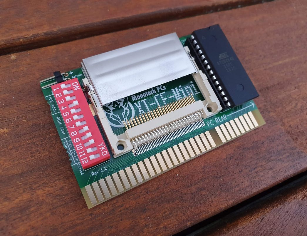 Click on photo for larger view. This is simply a rebranding of the 'Monotech XT-CF-Mini Rev 1.1'. Click here to see the back. Like for the 'Monotech XT-CF-Mini Rev 1.1', this card requires a CF card that works in 8-bit mode - the vast majority do, but not all - see note 1 below. |