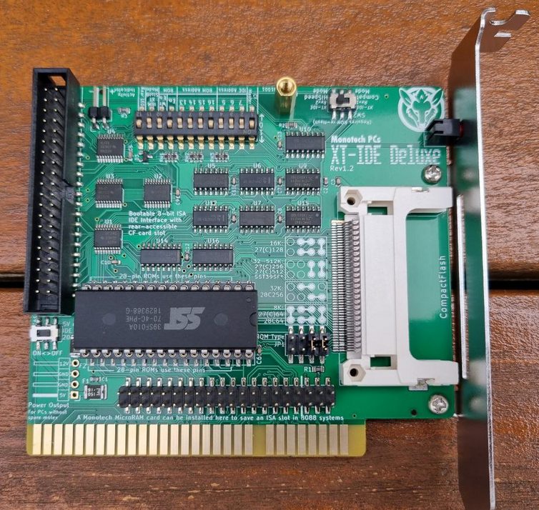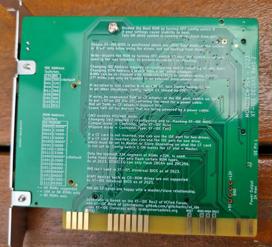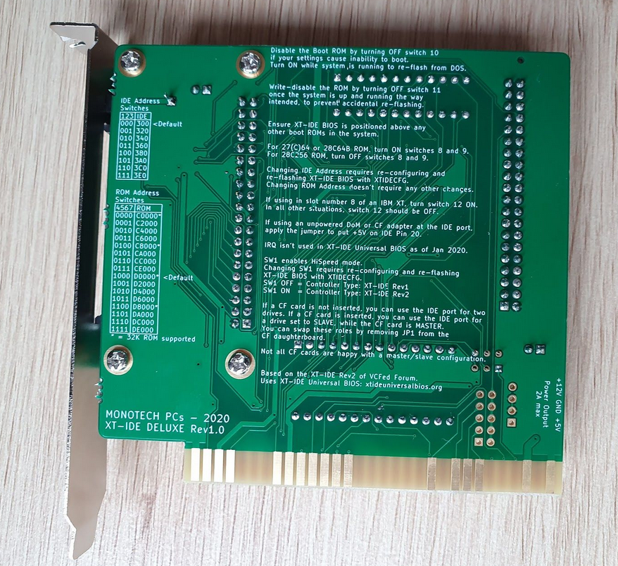 Circa 2023. Click on photo for larger view. "Rev1.2" appears on the front and back of the card. Monotech's advertising web page at here. Design information at here. Circuit diagram at here. The settings of the switches in the 12-switch block are different to previous versions. Does not require a CF card that works in 8-bit mode. Configuration of adapter/controller/device type in XTIDE Universal BIOS (a.k.a. XUB): If SW2 set to compatibility mode, set the 'Device type' in XUB versions 2.x.x and Rxxx to 'XT-IDE rev 1' If SW2 set to hi-speed mode, set the 'Device type' in XUB versions 2.x.x and Rxxx to 'XT-IDE rev 2 or modded rev 1' |
