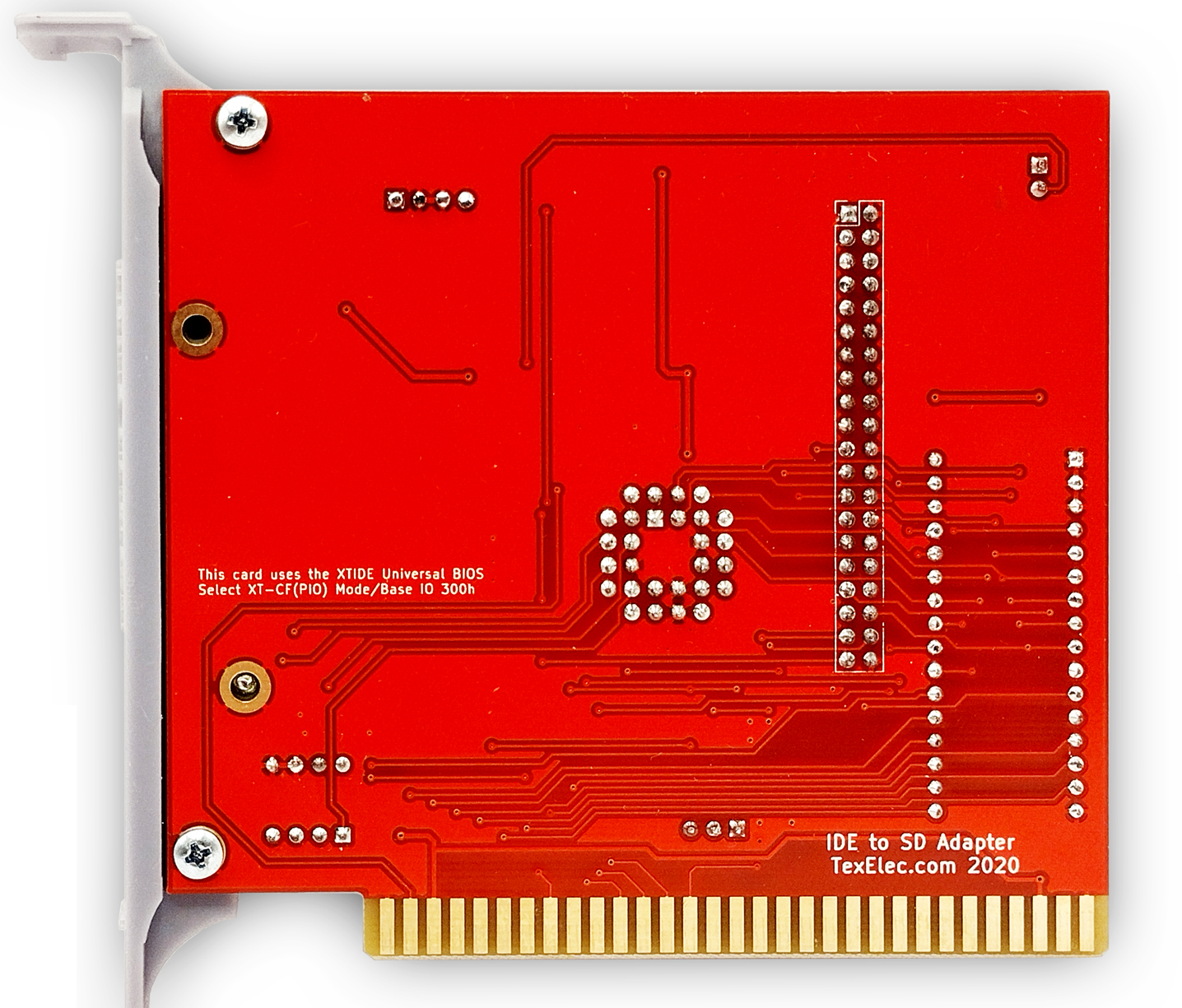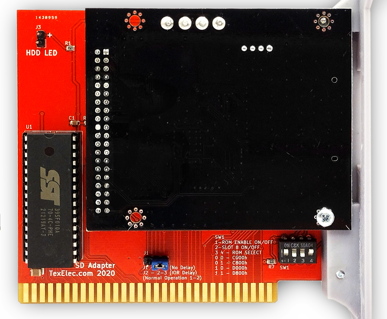 Circa 2020. Click on photo for larger view. "IDE to SD Adapter" and "TexElec.com 2020" appears on back of the card. TexElec's advertising web page at here. "It is functionally equivalent to the popular Lo-Tech ISA CompactFlash Adapter"