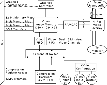 The digitized video data is sent immediately to the crosspoint switch and mapped into the frame buffer over one of two video channels. See Crosspoint Switch for more details.